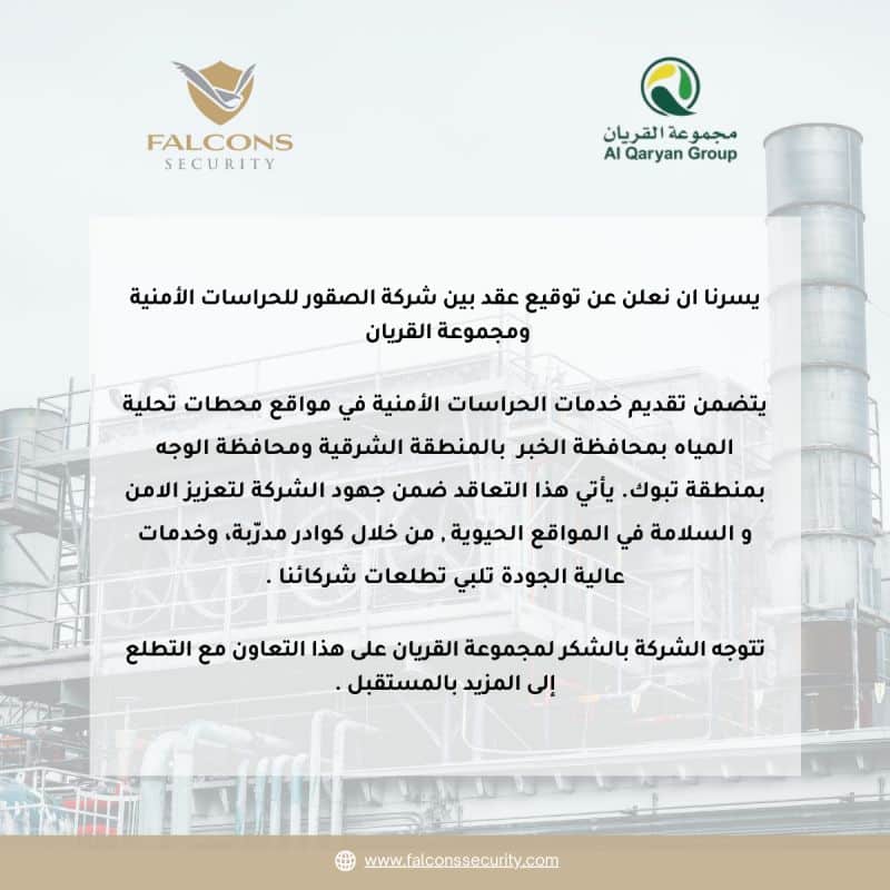 Falcons Security Guards is pleased to announce the signing of a contract with Al Qaryan Group to provide security services at water desalination plant sites in Al Khobar, Eastern Province, and Al Wajh in the Tabuk region.